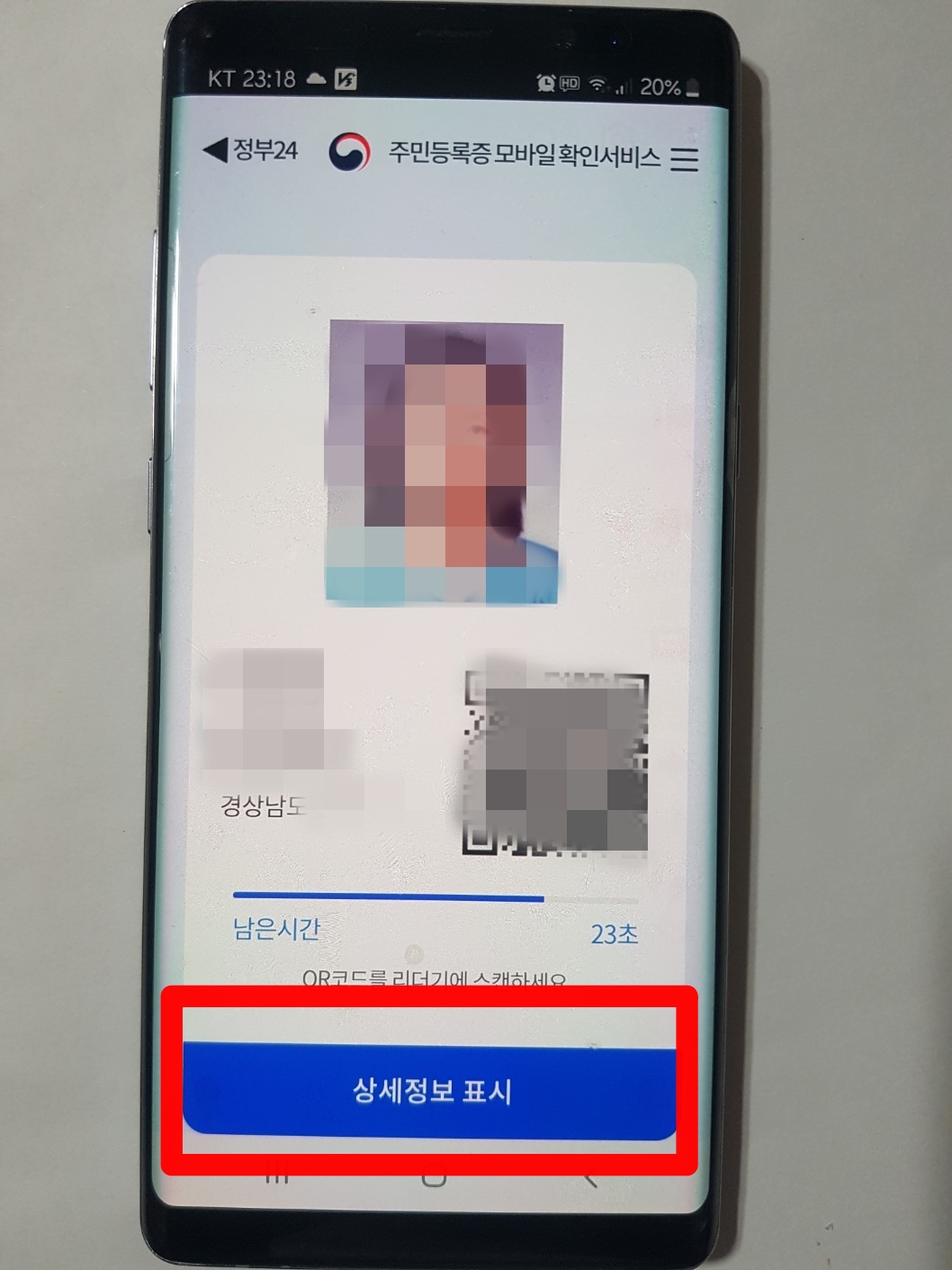7. 아래처럼 모바일 주민등록증이 발급됩니다. QR코드로도 본인확인 가능하며 상세정보표시 클릭하면 개인정보(이름, 주민등록번호, 주소) 상세확인 가능합니다.