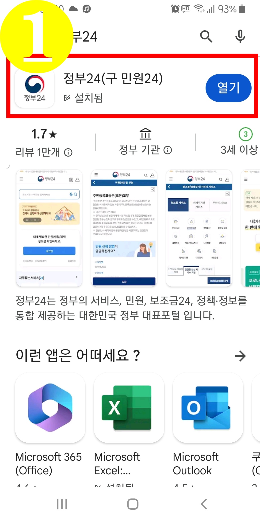 1. 정부 24 앱을 play스토어에서 검색 후 설치하기 합니다