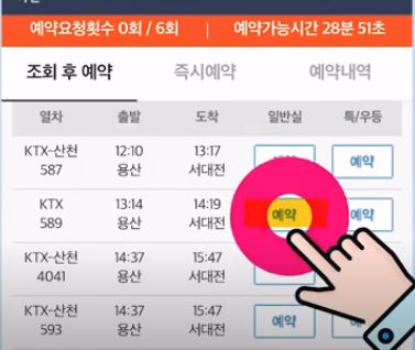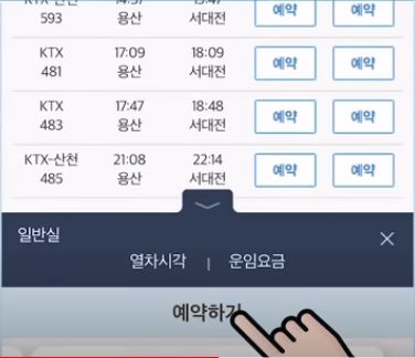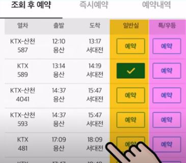 7. "조회 후 예약"을 누르고 일반실 또는 특/우등실 중 "예약"선택하고 "예약하기"를 누릅니다.